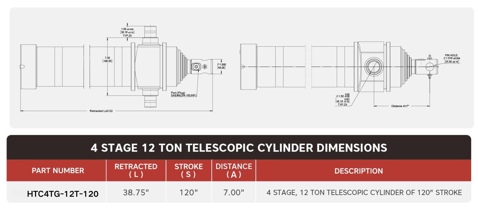 "HTC4TG-12T-120", 4 Stage, 12 Ton Of 120" Stroke Telescopic Cylinder