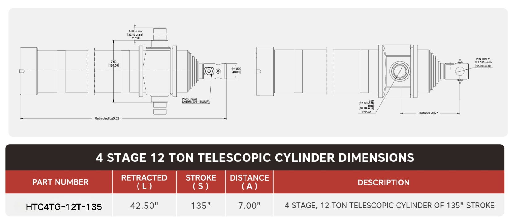 "HTC4TG-12T-135", 4 Stage, 12 Ton Of 135" Stroke Telescopic Cylinder