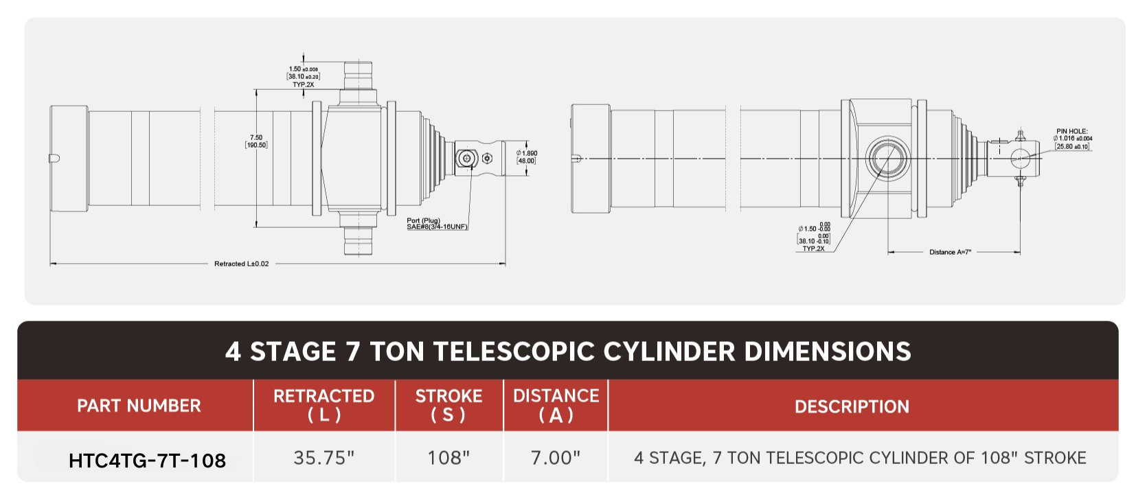 "HTC4TG-7T-108", 4 Stage, 7 Ton Of 108" Stroke Telescopic Cylinder