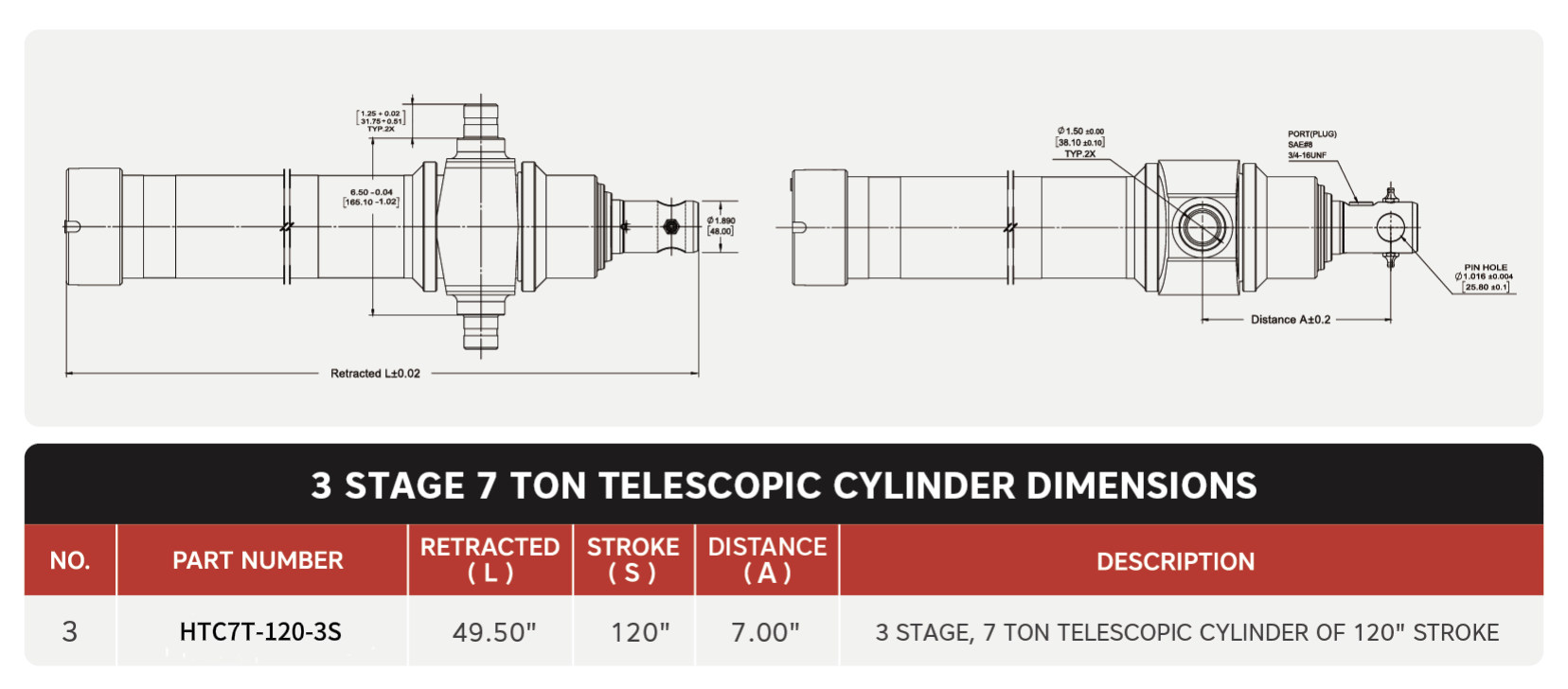 "HTC3TG-7T-120", 3 Stage, 7 Ton Of 120" Stroke Telescopic Cylinders