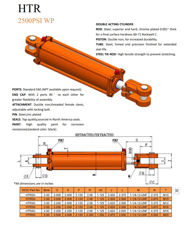 ກະບອກສູບເຊື່ອມ HCIC ມາດຕະຖານ Clevis ນີ້ມີຮູ 4 ", ເສັ້ນເລືອດຕັນໃນ 36", ແລະ rod ເສັ້ນຜ່າກາງ 2". ການສະແດງສອງເທົ່າ SAE 8 (-08) ORB(F) ພອດເຮັດວຽກ ຄວາມກົດດັນການເຮັດວຽກສູງສຸດ 2,500 PSI Clevis mounts 1" pins mounting ລວມ ສີດຳເປັນເງົາມີຄວາມທົນທານ ແລະທົນທານຕໍ່ການຈາງລົງ